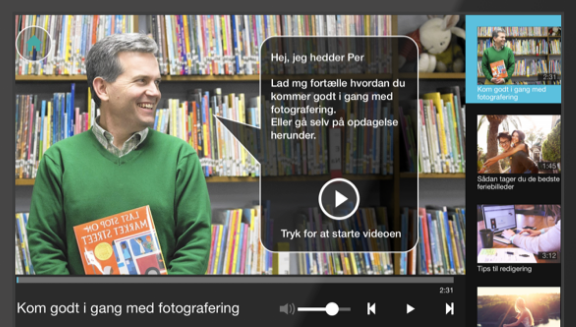 Fremvisning af videoer i toppen imens brugeren kan vælge relateret indhold i bunden. F.eks. video med forfatter, hvor hans bøger vises nedenunder.