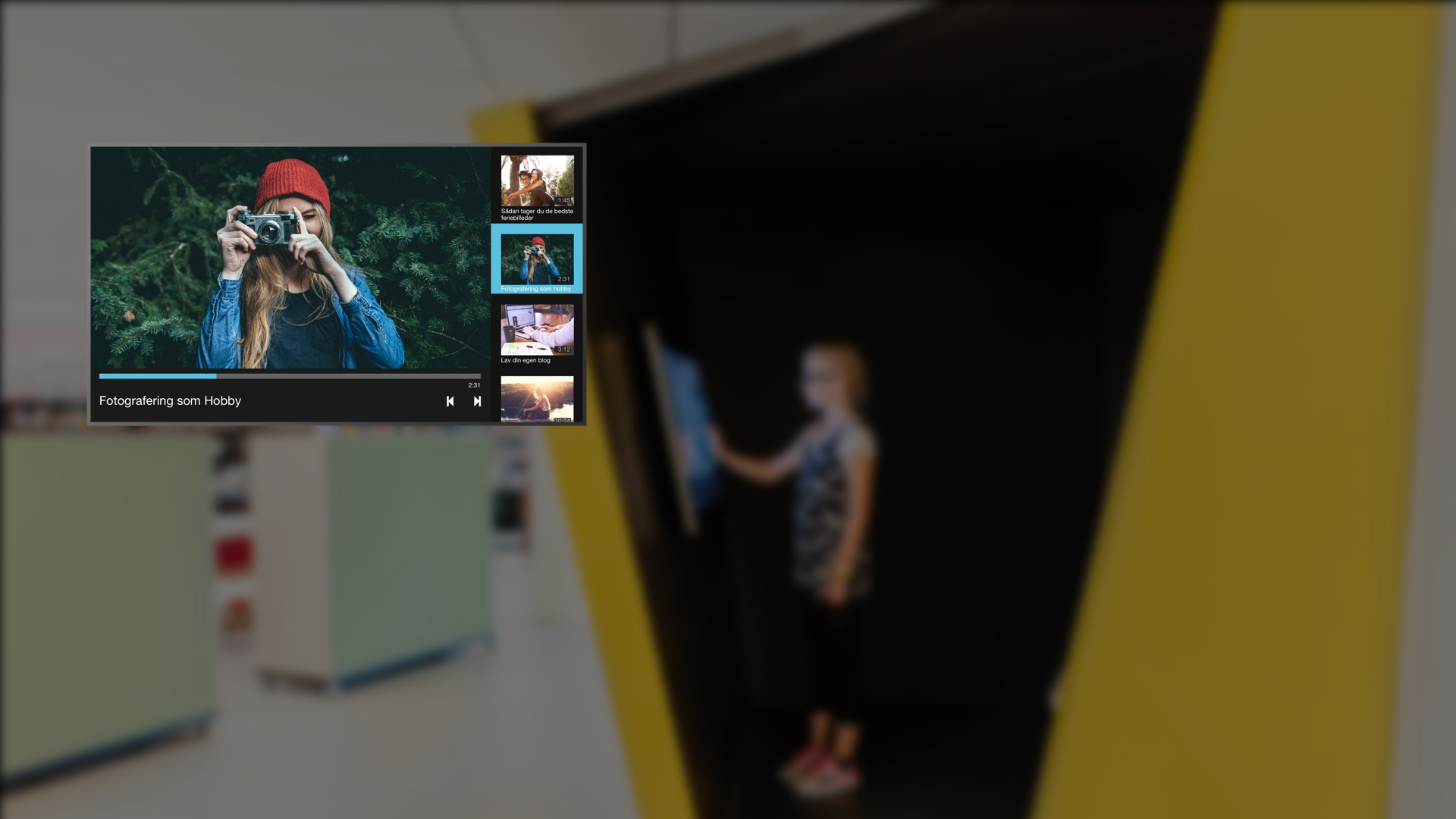 Editors may create and upload their own content to be shown on selected screens. It is possible to compile lists of several different videos and screen them in a chosen sequence. Alternatively, videos can be played from YouTube. The time interval will automatically be adjusted to the length of the videos.